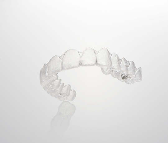 インビザラインは、アライナーと呼ばれる透明なマウスピースを用いて歯を移動するため、周囲に気付かれることなく歯並びをきれいにできます。よほど近くで凝視しない限り、マウスピースを装着しているようには見えません。また、樹脂で作られたマウスピースは極めて薄く、歯列に沿った形態を付与されており、異物感・違和感も小さくなっています。