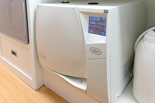 歯を削るときに使うタービンやハンドピース用の、専用滅菌器。患者さまごとに滅菌された器具を使い、院内感染を予防しています。
